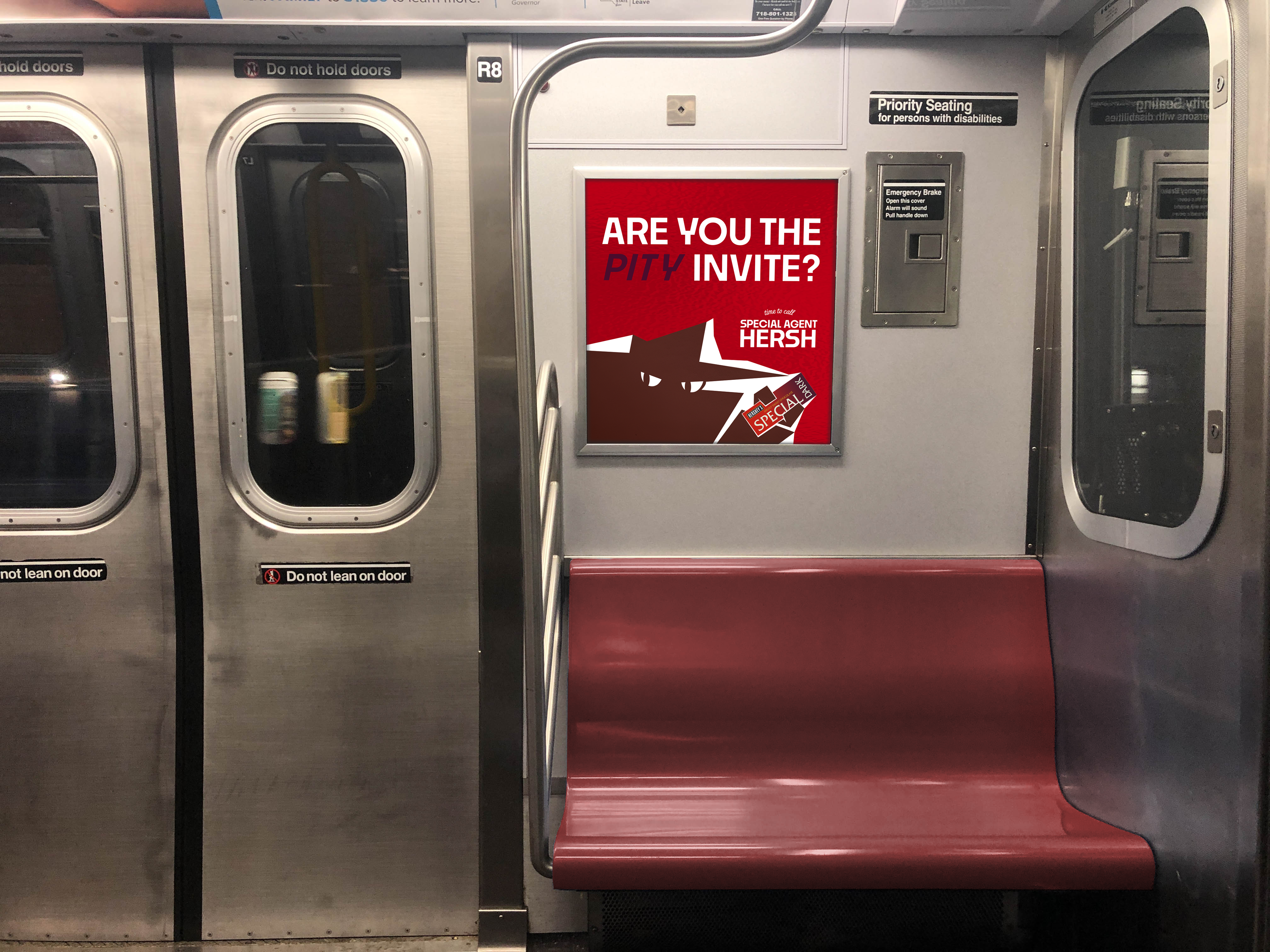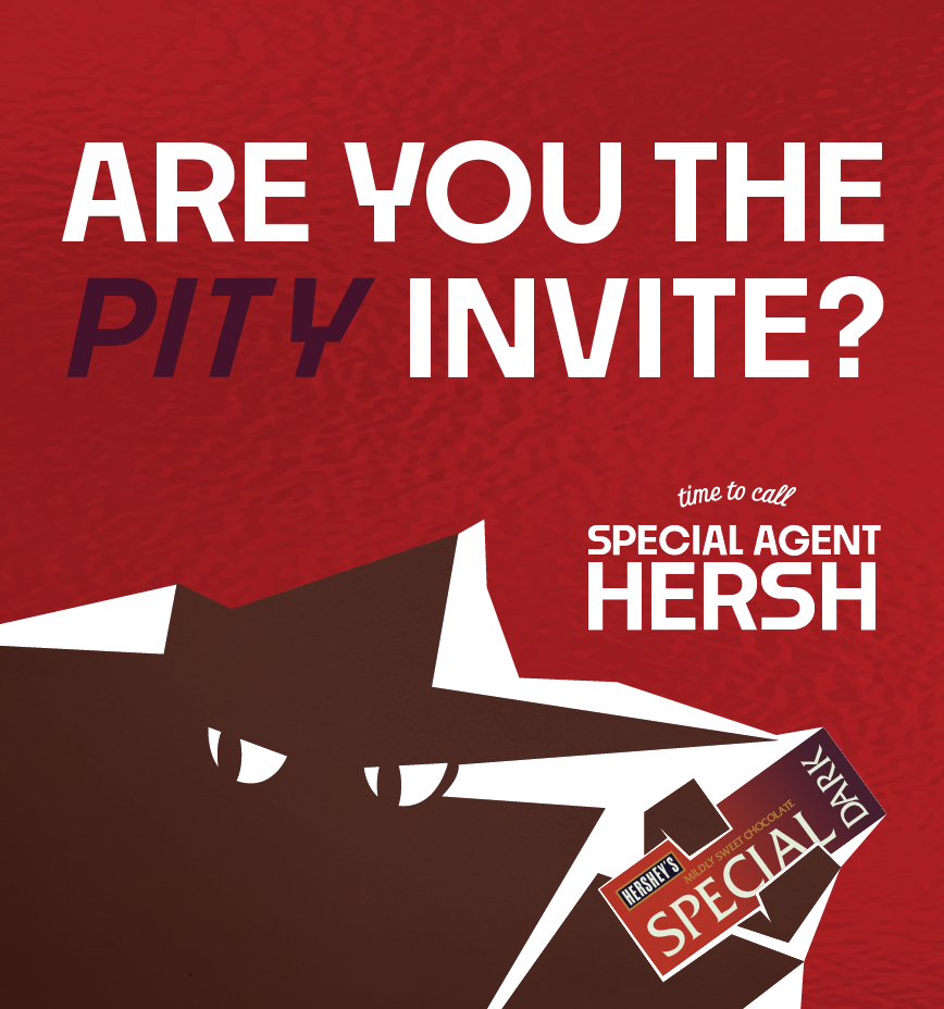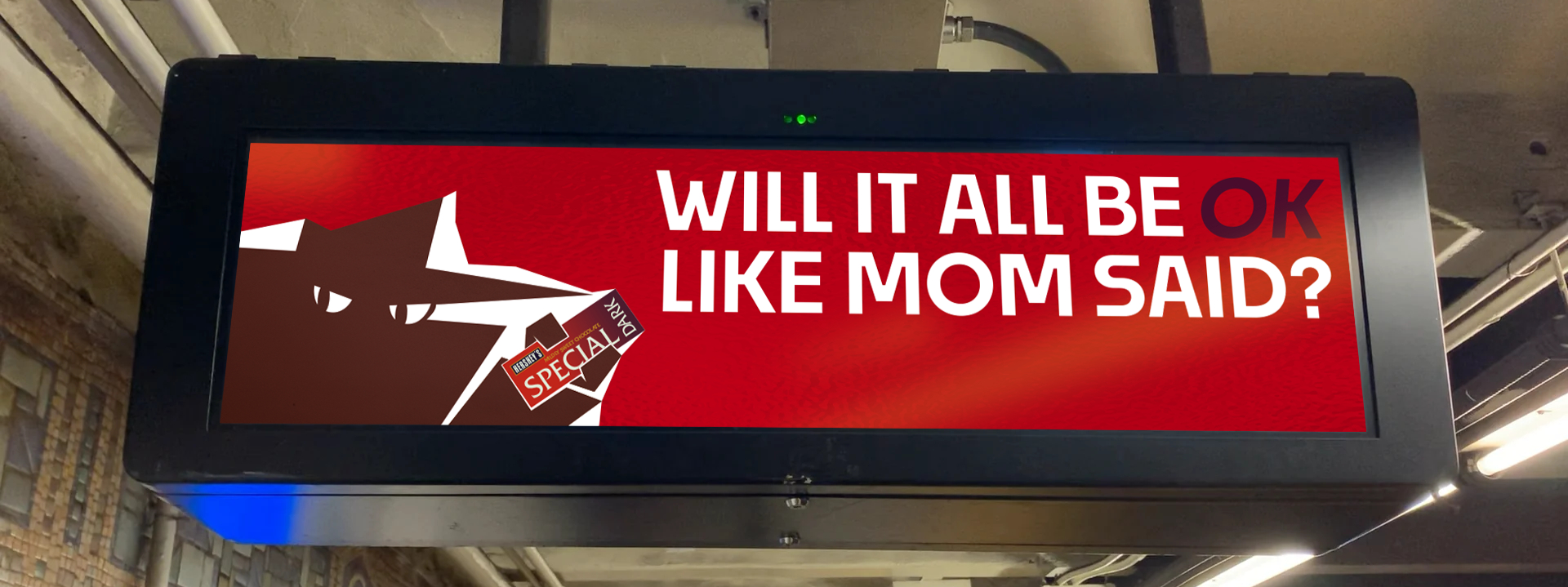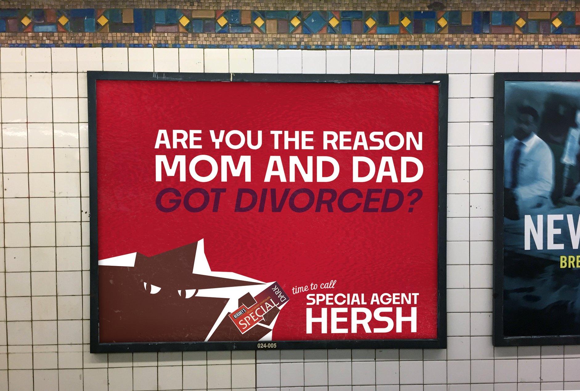 Dine-in with Special Agent Hersh during your morning commute at the Dark Thoughts Diner, sprinkled throughout the subways of NYC. Plenty of ways to order: Small Bites Into the Psyche, Existential Entrees, A La Carte Conundrums. No matter what your order, you'll always get THE SPECIAL, a delectable pip of Hershey's Special Dark Chocolate.